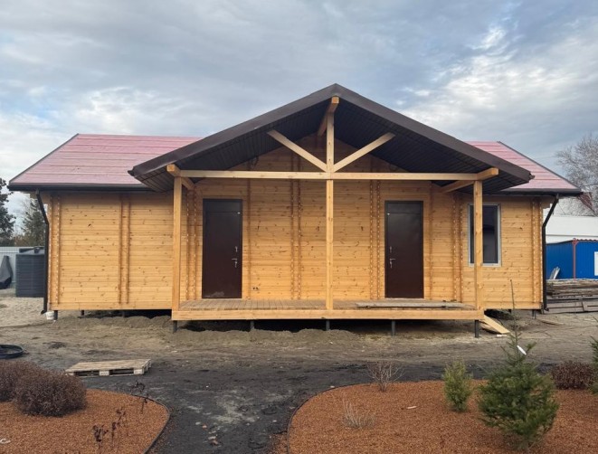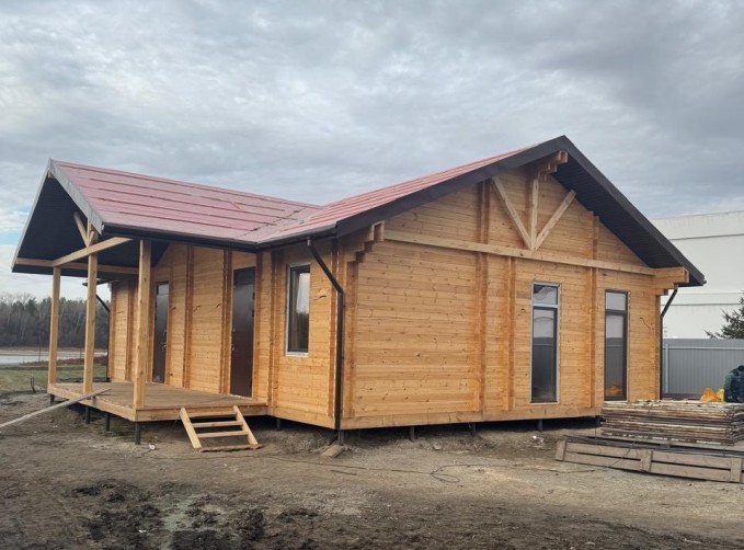 Сформированы фронтоны и проёмы; контур стен завершён, площадка готовится к монтажу балок перекрытия и стропильной системы.