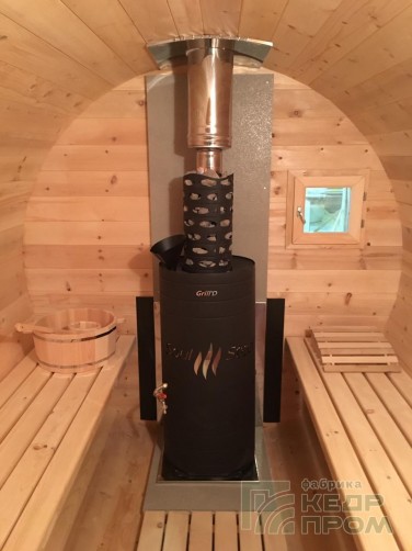 Баня-бочка квадратная длиной 4 метра с верандой. Баня имеет два отделения – парная и комната отдыха, а также открытую веранду или крыльцо с двумя сидениями. Комната отдыха у этой модели чуть меньше за счет добавления веранды, но парная полноценная и большая. Все остальное в комплекте: печь с камнями, бак для горячей воды, полки, трапики, окна.