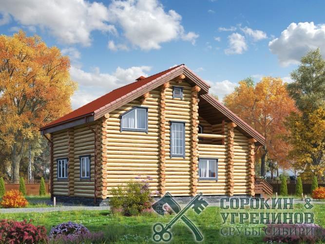 Проект двухэтажного дома площадью 180м2, из бревна диаметром 280мм. Размер сруба 910х12 метров. Первый этаж имеет террасу, лестничный холл, гостиную, кухню, санузел и спальню. На втром этаже три спальные комнаты, холл, санузел, гардеробная, балкон. Дом построен в Северном Казахстане в городе Гараганда в 2012 году.